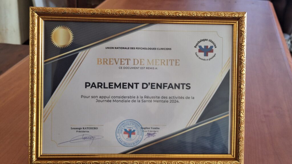 LL’Union Nationale des Psychologues Cliniciens dont son siège est en ville de Beni, a décerné un Brevet de Mérite au Parlement Enfants Grand Nord-Kivu dans l’Est de la République Démocratique du Congo, en reconnaissance de leur contribution exceptionnelle à la réussite des activités de la Journée Mondiale de la Santé Mentale 2024. Cet honneur revêt une signification particulière dans un contexte aussi difficile que celui du Grand Nord-Kivu, marqué par des années de conflits armés.